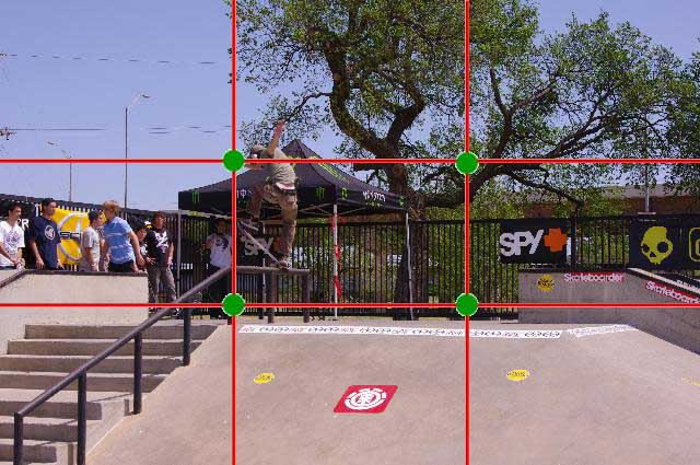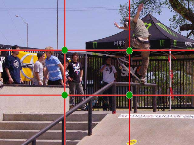Note how the photo now uses all three tips I mentioned. 1, the subject is now larger and the center of attention. By zooming in and cropping out a lot of the dead space, I have drawn more attention to the skater and made him the focal point. 2, the action now takes place right in the middle of our “rule of thirds” intersection. 3, the skater is now moving toward the center of the photograph.