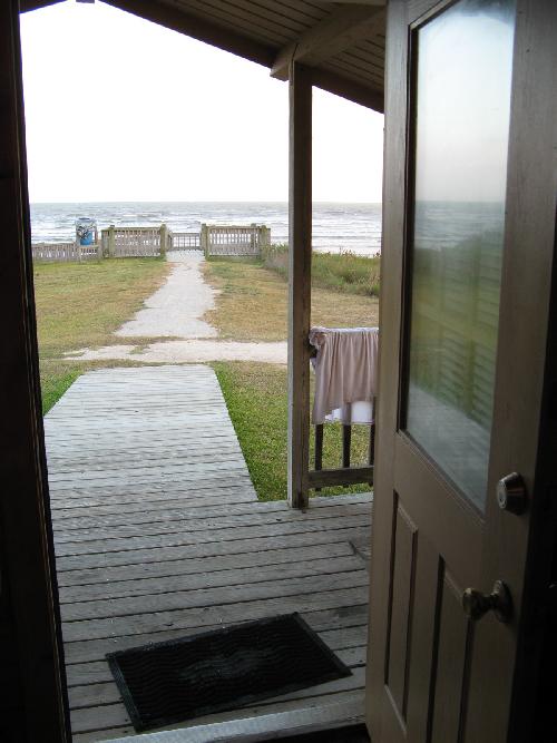 Our cabin is approximately 12×25, and divided into two rooms. It’s tiny — that’s the bad news. The good news is, it’s less than 100 feet from the Gulf of Mexico. Literally, you walk out of our cabin, down a short path, and you’re on the beach.