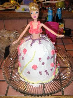 Morgan has requested a “doll” cake. So far we’ve taken two stabs at it. The cakes are coming out okay but the dress designs leave something to be desired. On the left is the one Susan did last week; one the right is the one I did last night. Unfortunately all the extra icing I used to increase Barbie’s bust fell off during the night. Gotta work on that part.