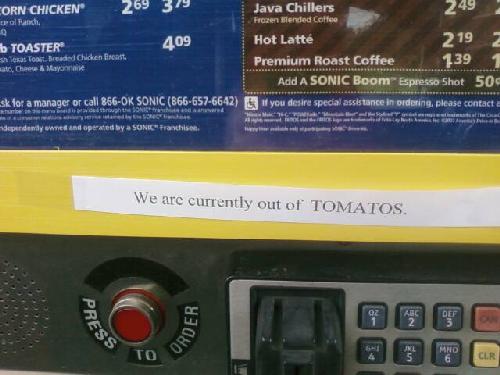 Due to the recent nationwide salmonella outbreak there appears to be a shortage of both tomatoes and the letter “E”. Spotted at a local Sonic restaurant. I think my favorite thing about this one is how it is stressed in all capitals, as if to say, “ATTENTION CUSTOMERS, THIS WORD IS SPELLED WRONG.”