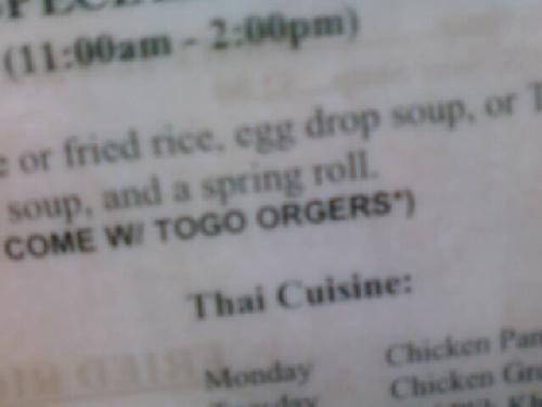 I realize Thai menus may seem like easy picking when it comes to typos, but I found this one particularly entertaining. Soup and spring rolls come with “TOGO ORGERS,” not to be confused with “Togo the Ogre,” whom they just can’t seem to give away.