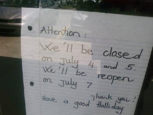 And then there’s July 6th. The restaurant will “be closed on July 4 and 5” and will “be reopen on July 7.” I feel like the goofy “be reopen on” typo is a herring to throw you off of the real problem here — what the hell is everybody doing on July 6? I forget if this is the year of the Rat or Chicken or whatever but I’m wondering if it doesn’t only have 364 days in it. Don’t you kind of get the feeling that something kickass is happening on July 6th that we’re not invited to? How am I supposed to have a good Holliday while thinking about that???