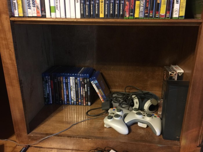 With the additional spacer shelves in place, I was able to fit all our disc-based video games along with all my Blu-ray movies (I don’t have very many) on the shelves without having to stack them horizontally. Success!