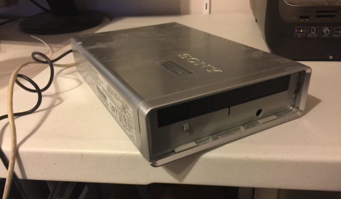 I was cleaning my computer room last week and ran across my old friend in the back of a closet. I plugged it in, but time got the best of it. The gears that open and close the tray appear to be gummed, and even once I forced a disc inside, it would no longer read it. With piles of other drives laying around, all smaller, lighter, and faster than this one, I decided it was time to part with my old friend. For the second time in its life it got thrown across the room — this time, for good.