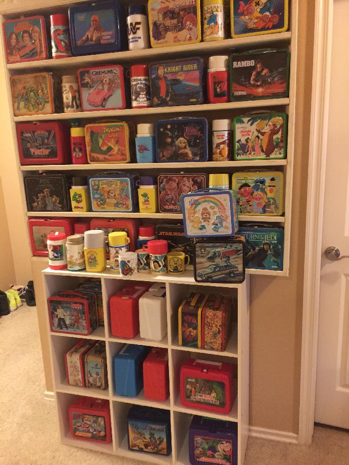 Over the past week I’ve picked up three new vintage lunch boxes: The Fall Guy, Annie, and the Care Bears. In the picture above, you can see the The Fall Guy and Care Bears lunch boxes stacked in front of some of the others. The cube holding the Annie lunch box is three boxes deep.