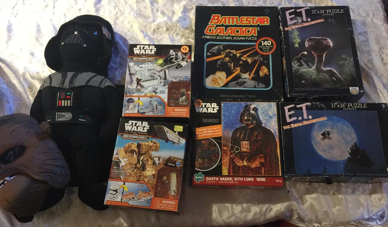 I’m a sucker for anything Star Wars and other vintage things from the 70s and 80s, so this picture should not be entirely surprising. The Chewbacca mask and the Darth Vader doll were both a dollar. The four jigsaw puzzles on the right were fifty cents apiece. I paid $5 combined for those two Star Wars Micro Machines sets, but they were brand new. The host of that particular garage sale appeared to be one of those rabid couponers. The entire driveway was filled with random items, all new and unopened in their original packaging, at rock bottom prices.