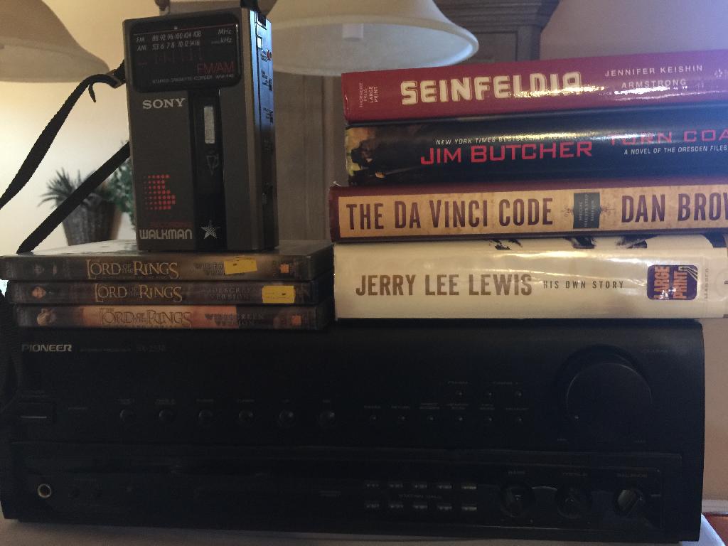 I paid $3 for that Sony Walkman, which came with its original paperwork. That Pioneer tuner, which was only a dollar, is set to replace one out in the garage that died a while back. I couldn’t remember if I already had all three Lords of the Rings movies on DVD, but they were all 2-DVD Special Edition Widescreen editions, so for a buck each I decided to take a chance. I paid a buck each for those hardback books the weekend before at a book sale, but they were still downstairs so I threw them on top of the pile while taking pictures.