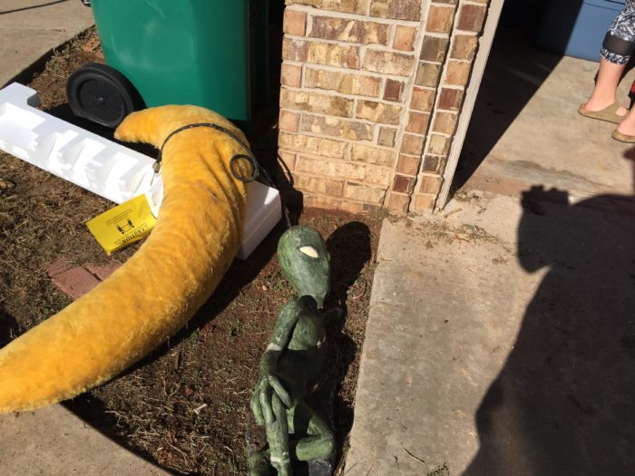 By the time Susan and I moved back to Oklahoma in 1998, Mr. Moonpie’s life began to slow down. When Mason was born in 2001, I put the big stuffed banana in his room, but a couple of years later Mason was done with him, and Mr. Moonpie was sadly relegated to life in the garage where — I hate to say it — he’s spent the past fifteen years.