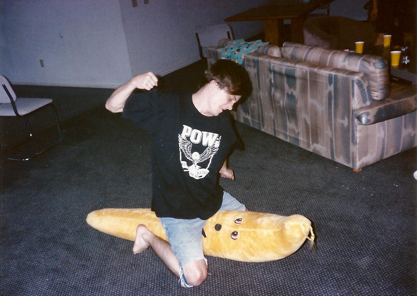 Still, Mr. Moonpie marched on. In 1996 when Susan and I moved to Spokane, Mr. Moonpie came with us. He was such a staple of our local BBS scene that even after BBSes began to succumb to the popularity of the internet, Mr. Moonpie’s popularity lived on. While in Spokane, I made no fewer than three different short films, all starring Mr. Moonpie. One was a parody of Cops, one was a parody of X-Files, and the third was a parody of the OJ Simpson trial. Each one was roughly ten minutes in length, and there was a longer piece planned to bookend and tie them all together that never got finished. Keep in mind that these were made before digital editing and video hosting were available to most home users. The videos were crudely cut together through the use of two VCRs, with over-dubbed voices and extremely crude computer graphics inserted for placards.