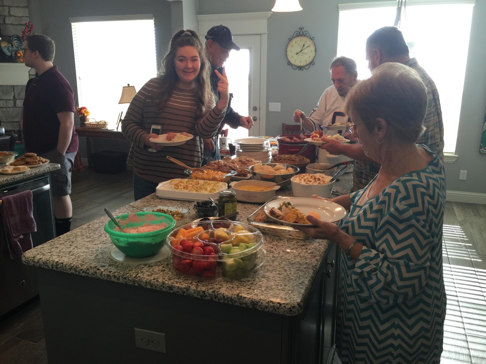 The open design of our new house allowed the holiday scents of baked and cooked ham to waft through the entire house. As I sat in the living room watching the Macy’s Thanksgiving Day Parade (my own tradition), my stomach rumbled from all the smells coming from the kitchen! An hour or two after the parade ended, our family began to arrive. Some people sat in the front room and some people sat in the back room, but nobody was isolated from the gathering (as sometimes happened at the old house). The kitchen island worked pretty well as a serving area while the bar between the kitchen and living room was a natural place to stage desserts. Things were different, and things were the same.