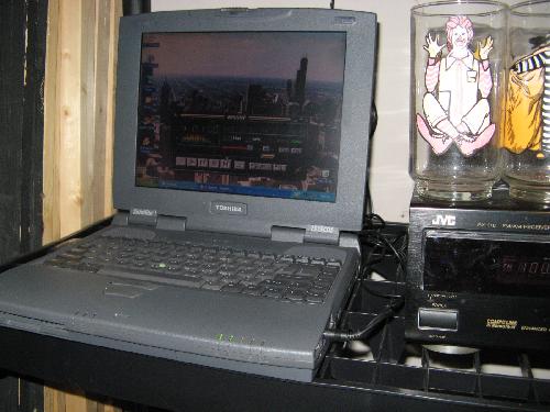 (Over an hour goes by. The laptop is reconfigured and joined to my home domain. A wireless card is added. Remote Desktop is configured and Winamp is added. The laptop can now stream MP3s wirelessly from the upstairs server.)