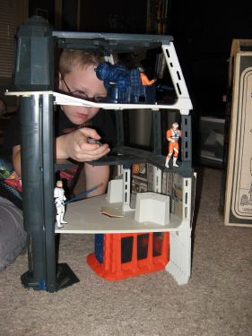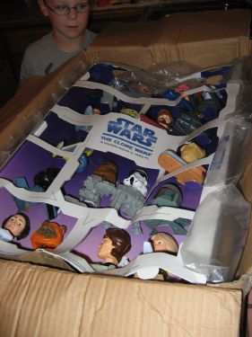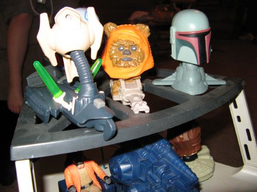 The cardboard display case didn’t do so well during shipping, but that’s okay. What Mason really wanted was the bobble heads, and now he’s got ’em. It didn’t take long before the bobble heads moved into the Death Star, too.