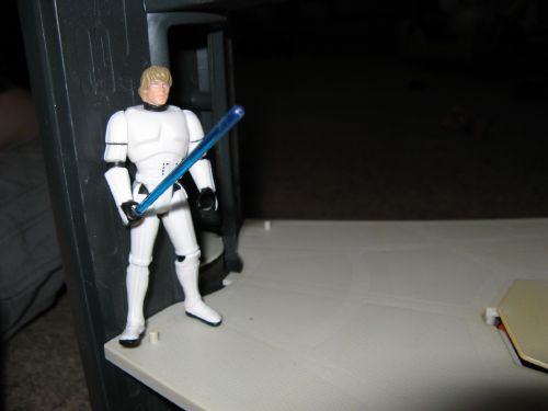 Here’s Luke in a Stormtrooper disguise, guarding a doorway.