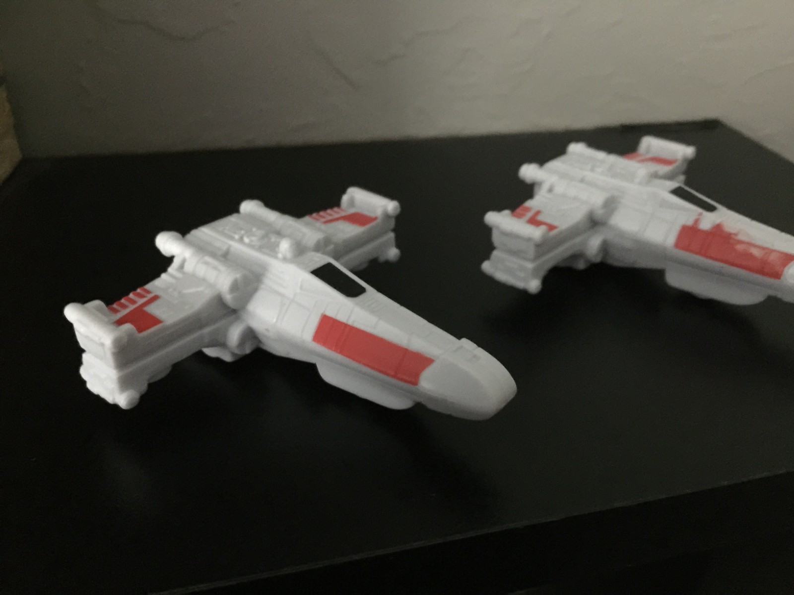 I haven’t written a “Star Wednesday” article in several months because all of my Star Wars collectibles are tucked away in a storage unit. “Out of sight, out of mind,” so to speak. Last weekend, my wife helped put together a fundraising garage sale for the Girl Scouts. While we were dropping off donations, I spied these two miniature X-Wing fighters in a bargain bin, and picked them up.