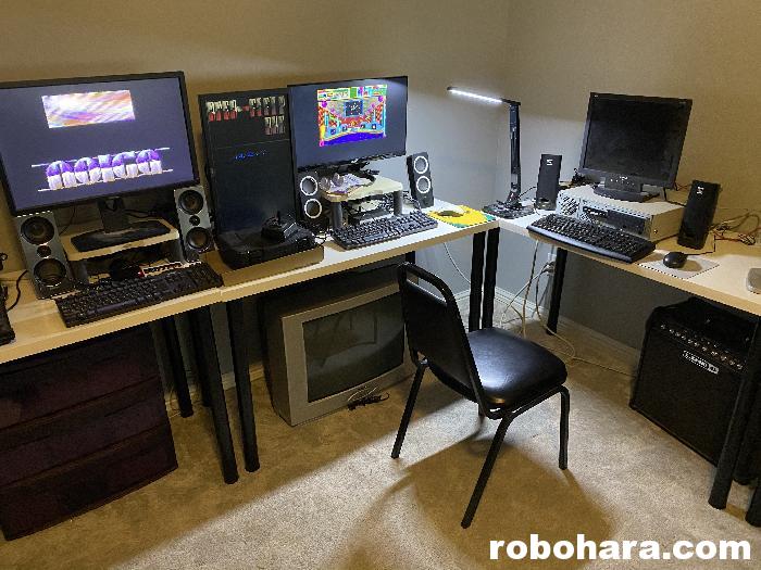 The tables are laid out like a letter “M”, and the left side of the room I’ll be dedicating to old computers. Right now I’ve got a Raspberry Pi acting as my Commodore 64, PyANS (another Raspberry Pi that displays ancient BBS ANSI artwork), my MiST FPGA machine (currently configured as an Amiga), and my old DOS machine (486 DX4/100). The last piece of the puzzle was a PS/2 keyboard, which my sister was able to provide after digging through some old piles of hardware.