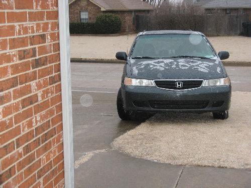Today’s ice storm left the roads icy — like, real icy. And unfortunately, our driveway is so steep that when it’s icy, the cars just slide down the driveway and end up out in the road. That is, unless you can get a couple of tires up onto the lawn itself, which is what I did.