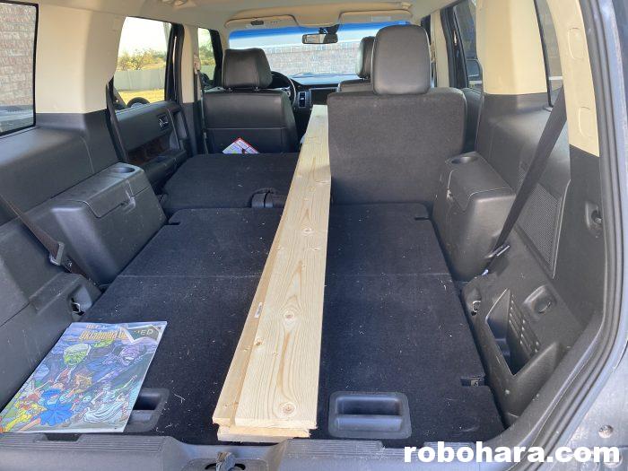 The next morning I brought in two of the pieces of wood. Since each piece was 8′ long and the wall was a little over 15′ long, I put one piece in place, put the other one in place, and marked where the two overlapped with a pencil. Then I took the second one back out to the shop, cut it on the line, and used it as a template for two of the other boards. The final result was three 8′ boards, and three that were just over 7′.