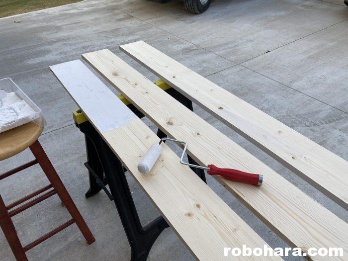 I went to Home Depot with the intention of buying pre-laminated white shelves to use, but no matter how I sliced or modified my plans, they didn’t have enough pieces of wood of the same depth for me to make the shelves. The closest I came was using a bunch of 4′ long shelves, which would have come to more than $200 after tax. I really wasn’t wanting to paint lumber for this project, but I found 8′ long pieces of wood that were 6″ deep (perfect for this project) at under $7 a board. I ended up buying six of those and paying less than $50, and I already had a gallon of white paint at home.