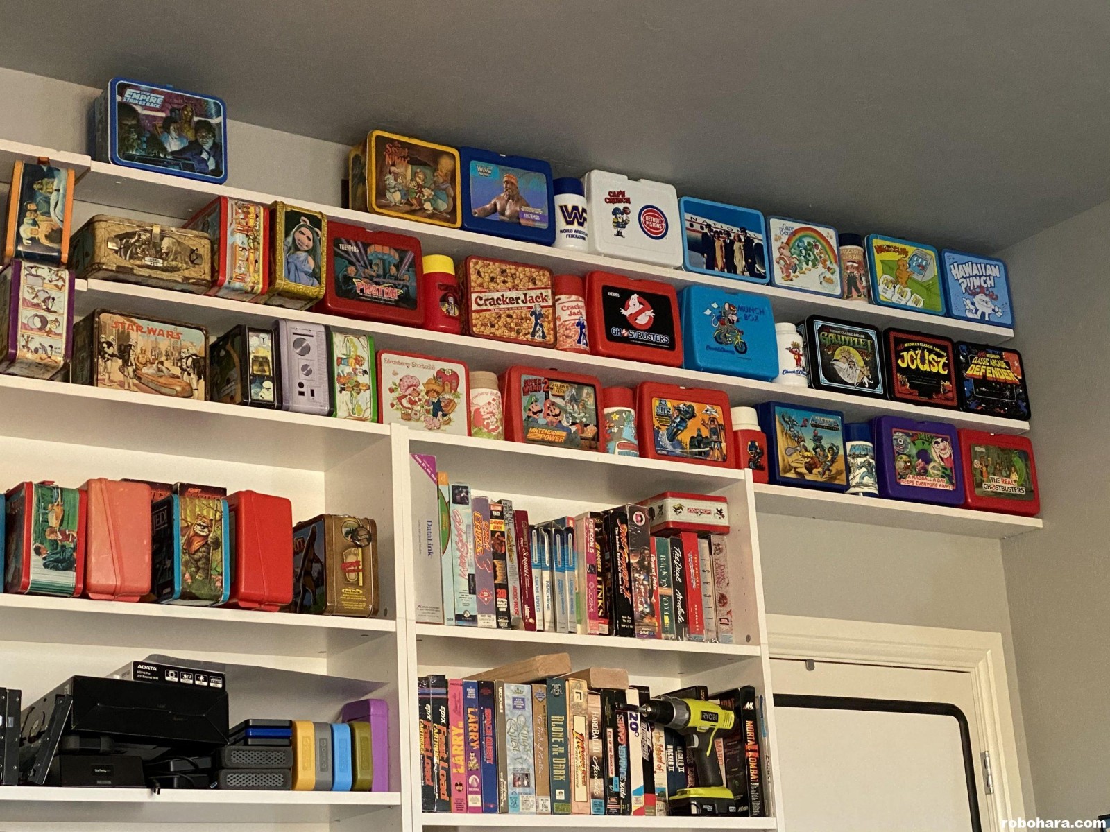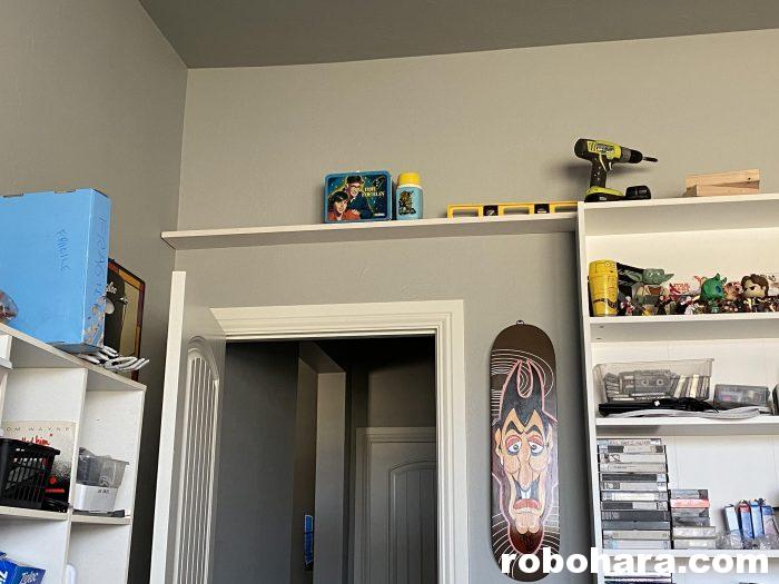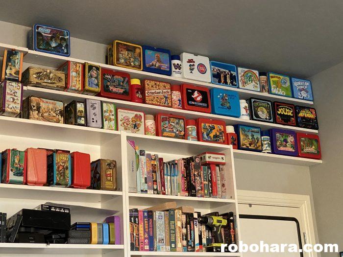Since moving into my new home office, Susan has been nudging me to unpack my lunchbox collection and put them back out on display. I enjoy looking at my old lunchboxes, and we agree that having them stowed out in the garage inside moving boxes (where they’ve been for two years now) isn’t bringing anyone any joy. A few weekends ago, I decided to spend a day building new shelves for my old lunchboxes.