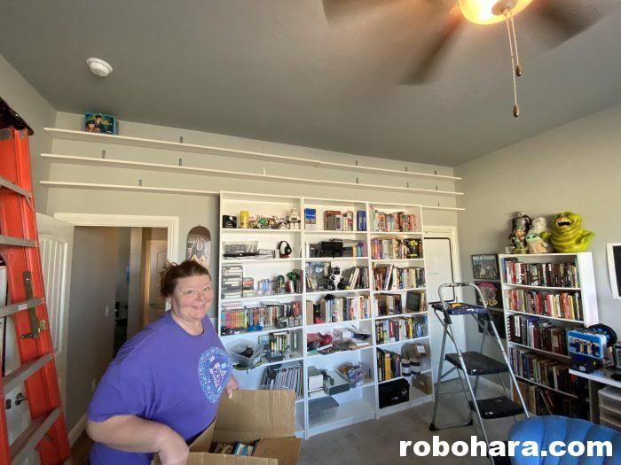 Once the second row of shelves was complete, I repeated the process to get the top shelf attached. While I did that, Susan brought three large boxes full of lunchboxes in from the garage.