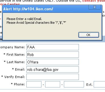 So what happens when you go to a website that requires your work e-mail address, but won’t accept apostrophes? Well, we’re screwed. It happened to my dad last night, trying to create a trouble ticket on IKON’s website. I just verified it.