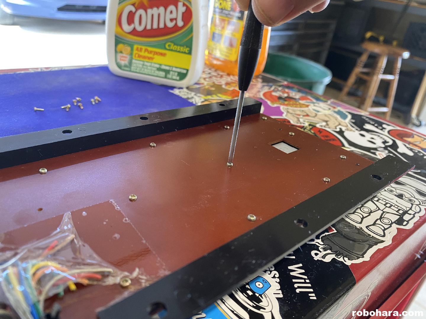 The circuit board is held in place by 23 tiny screws. If it were built today it might have six, or four, or none at all — just some tabs that would break when you tried to remove it. Someone, at some point in history, looked at this circuit board and decided 23 was the perfect amount. There is no shortcut to removing them. A few of them are located under a clear piece of tape. I peeled away the tape trapping those screws 30 years ago. Thanks, younger me.