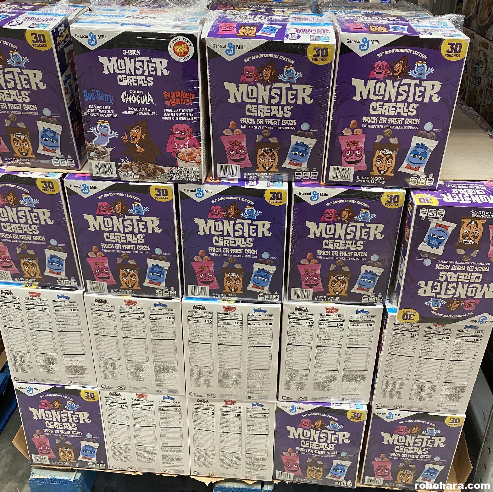 ALSO new this year were these boxes 30 packs of individually bagged cereal treats, also confusingly named “Monster Mash.” I found these at Sam’s; each box contains 30 packs (10 Count Chocula, 10 Frankenberry, and 10 Boo Berry), and the boxes were wrapped and sold in pairs. The little pouches are designed to be handed out on Halloween, but don’t contain anywhere enough cereal for a bowl of cereal, even for a toddler. They’re a delicious snack that will have you wanting an entire box. Hopefully a few boxes of cereal remain on shelves the first week of November.