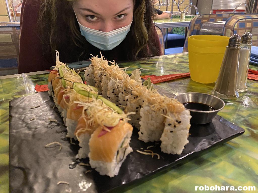 Our cruise spanned five days with two stops at port (Puerta Maya and Cozumel) and two full days at sea. We spent our first full day at sea getting our sea legs and refamiliarizing ourselves with the ship. We saw a disco show, played some games in the arcade, and of course, sampled all the food. Susan and I ate breakfast in the dining room each morning, alternating between scrambled eggs and omelets with sides of oatmeal, bacon, sausage, and at least one parfait. Along with the never-ending buffet, there was also a burger grill, a sandwich deli, a BBQ hut, a Chinese stir fry area, and a small sushi bar. Morgan and I got rolls of sushi (spicy tuna and “Bang Bang Bonsai!”) and went back again a few days later.
