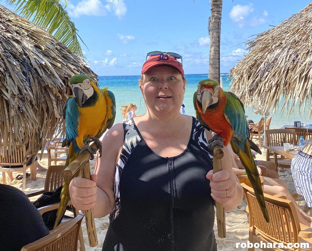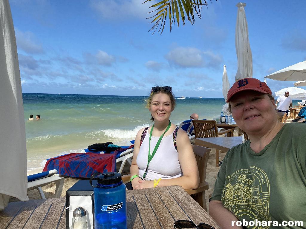 The next day at Cozumel, we visited a private beach called Mr. Sanchos for the first time. We had a really great time there. We had our own private table just a few feet from the ocean, and the $60/person fee included free food and drinks all day long. Our waiter (“Jhonny”) was only responsible for four tables and we could barely take a bite or drink without him rushing over to ask if we needed something else. We went swimming multiple times and had a fun, relaxing day. While we were on the beach, Susan made two new friends!