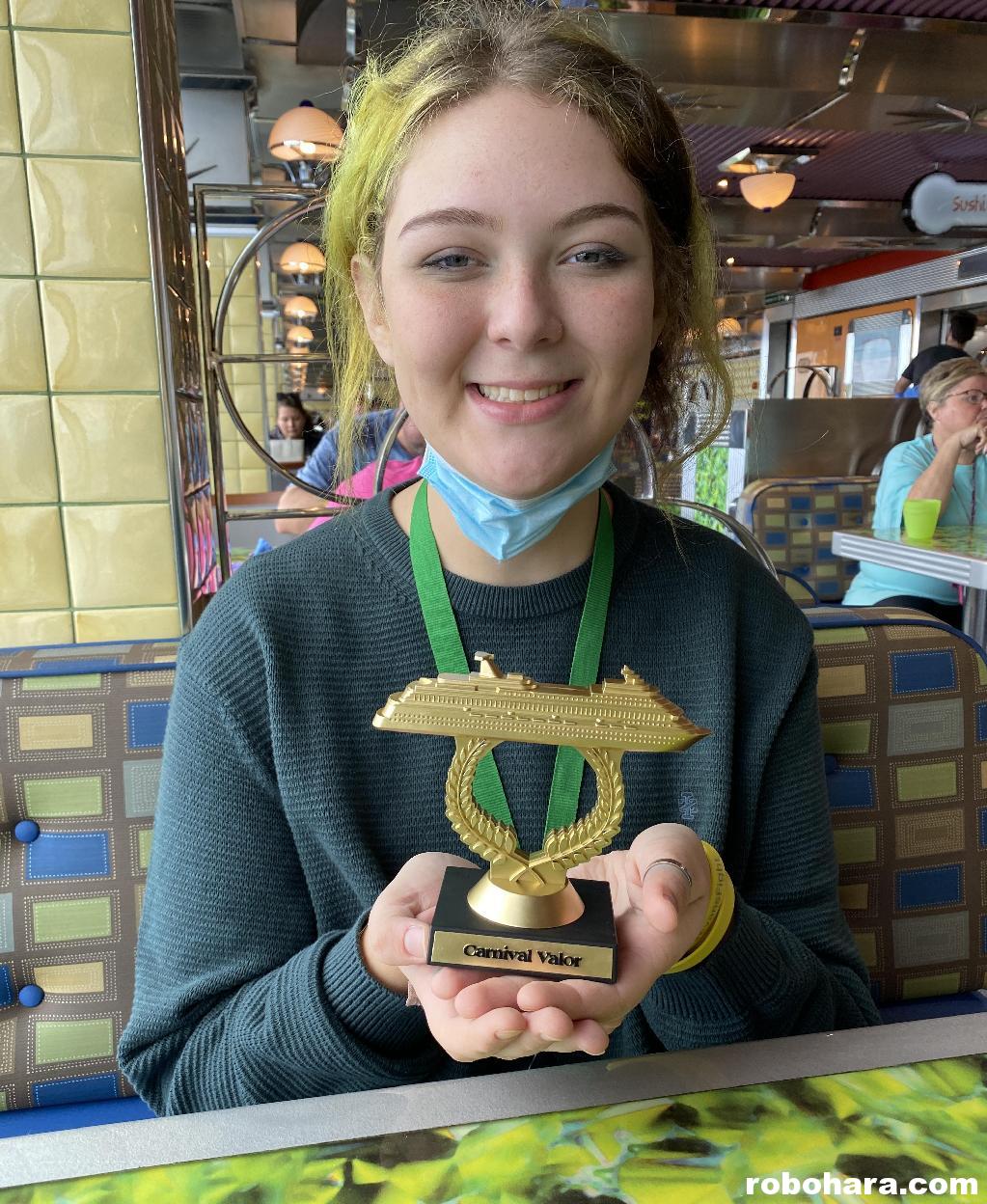 Wednesday was another full day at sea filled with activities. Morgan and Susan played Bingo twice, and Morgan spent some time hanging out with a friend whom she had met on a previous cruise. One of our favorite things to do is play the trivia contests on board. There are only four or five trivia games that take place each cruise, so coming in first place and beating everyone is pretty hard to do. At the last trivia session of the cruise, Susan, Morgan and I entered as a team and went 20 for 20, winning first place! Morgan accepted the trophy, which she attached to her lanyard and proudly displayed for the remainder of the cruise.