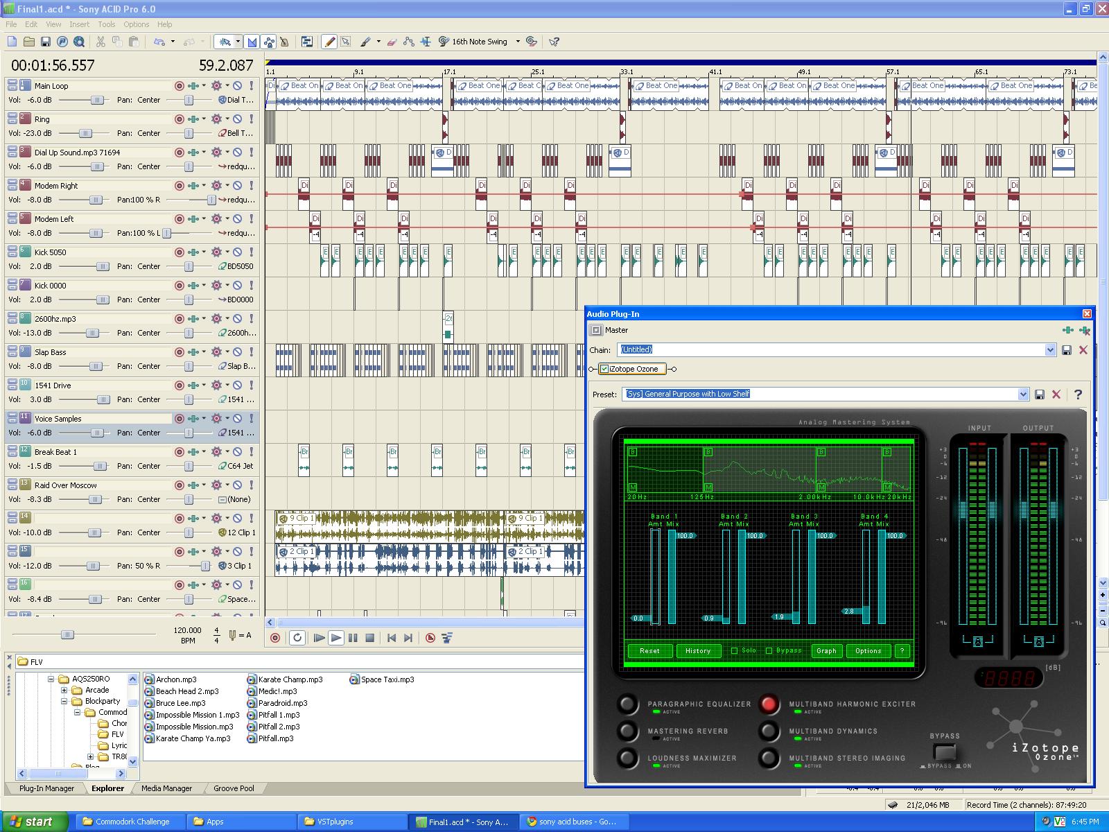 Compare that to a picture of Sony’s Acid 6.0 running on my PC today. In this track I ended up using 18 tracks — true, several of them had a lot of wasted space, but my medium-level PC had no problem keeping up with this many tracks so there was no reason to consolidate or be conservative. Somewhere, John and George are rolling over in their graves.