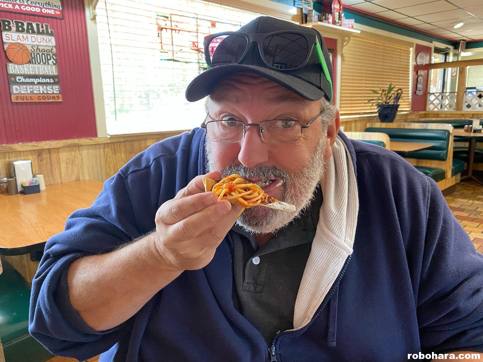 The pizza we had over the weekend tasted exactly how I remember Ken’s pizza tasting… and you can bet I piled a bunch of spaghetti on top of my thin crust pizza before digging in!