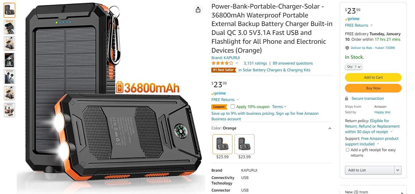 A few days after Christmas I was chatting with my buddy Sean about the winter storm that was about to sweep the nation. Sean lives just outside of Buffalo, New York and was expecting more than two feet of snow. While charging up all our USB battery packs in case either of us experienced a power outage, the topic of charging devices via solar came up. One thing led to another and within the hour I had found and ordered two of these USB battery packs with built in solar panels from Amazon. These charging packs claim to deliver a whopping 36,800mAh of power and and include everything from the aforementioned integrated solar panel to a built in compass! These battery packs typically retail for around $60, but right after Christmas I caught them on sale for $18 and so I ordered two of them, one for myself and one for Sean.