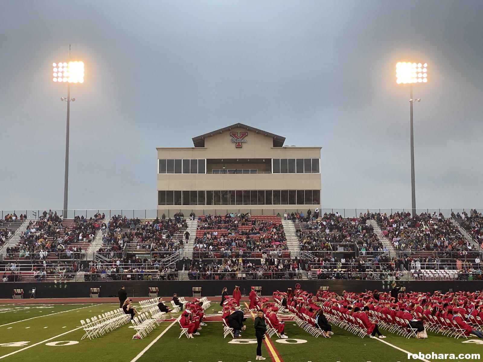 For several years now, Yukon High School has held their graduation ceremony outdoors in the high school’s football stadium. Back when Susan and I graduated, the ceremony has held indoors in the Fine Arts auditorium, and the 360(ish) graduating seniors were limited to inviting six guests. Yukon’s Class of 2023 had 660 graduating seniors, and by holding the event outdoors each senior was allowed to invite ten friends and family members. On the day of graduation there was a threat of severe weather, and a backup plan involved moving the event indoors and reducing the number of tickets per senior to three. Although the event was cloudy, windy, and a little chilly, the weather held out long enough for the outdoor event to take place.