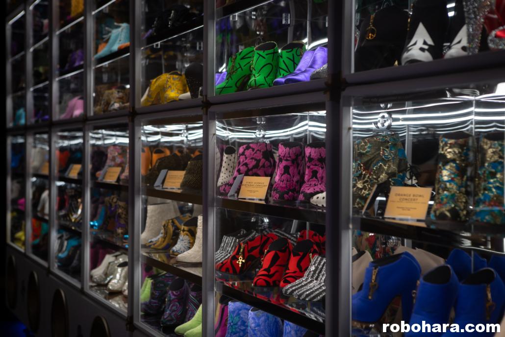Yes, 300 pairs — which, apparently, is about a third of the pairs of shoes located at Paisley Park. The blue shoes with painted clouds from the Raspberry Beret video are there, as are his Batdance shoes, his Super Bowl shoes, a pair of flip fops, and pretty much any other pair of shoes you would ever want to see. All of them are a ladies size 5 1/2, many of them with worn toes and heels from spinning and dancing on stage.