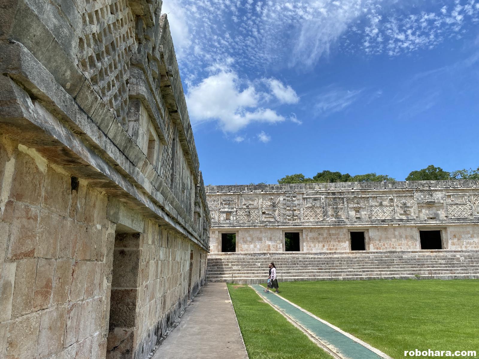 As I mentioned, although the pyramid is the tallest structure in Uxmal, there are several other remaining structures including a large nunnery, the governor’s quarters, and a large sports ball court where local games were played. The court has an inscription from 901 AD with a dedicated from Lord Chac.