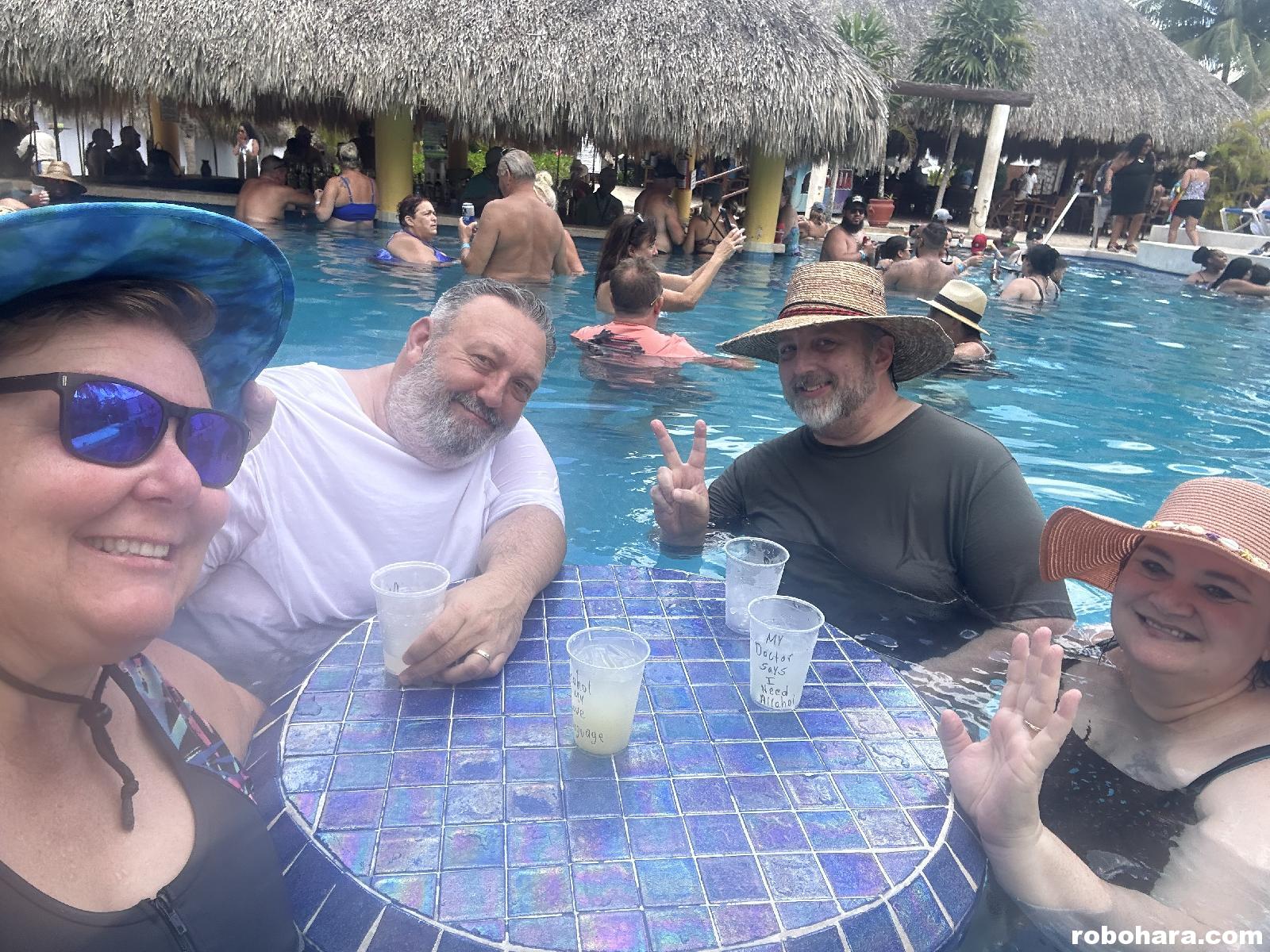While the August temperatures in Mexico were similar to Oklahoma’s, the 75% humidity was brutal. Rather than walk back and forth on the hot sand to reenter the ocean, we decided to relocate to a nearby pool, complete with with a swim-up bar. I introduced myself and Jeff to the bartender as “Roberto and El Jefe,” and before long he was mixing drinks we hadn’t ordered and summoning us to the var to retrieve them. Susan and Heather did their best to keep up. Susan and I quickly learned the bartender’s idea of a margarita was to fill a glass 90% full of alcohol, add a dash of flavor, and top it off with more alcohol. I wouldn’t have wanted to drive anything after one or two, but fortunately I was never asked to drive either the taxi or the cruise ship. Partway through the day I began doing “an impersonation of a stunt man,” where I would fall backwards off my stool into the pool. Susan says it stopped being funny after the first dozen times but what does she know?