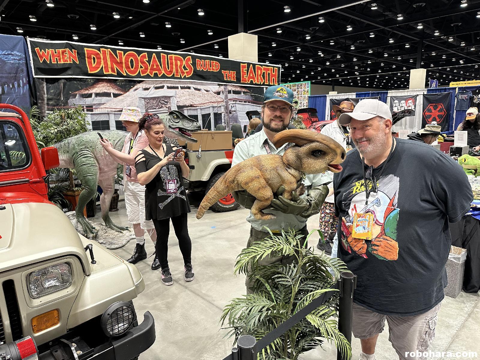 One of the best booths at the show was my friend Drew Stone’s Jurassic Park display. Drew has painstakingly recreated not one but two Jeeps from the film. He also had multiple dinosaurs on display, and an area set aside with multiple classic Jurassic Park videogames for people to play. Every time we walked past Drew’s booth there was a line of adults waiting to have their pictures taken and children waiting to pet the dinosaurs!