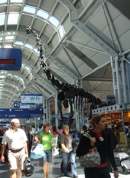 So anyway, first flight took me from OKC to O’Hare. I landed on one side of the airport and had 2 1/2 hours to get to the other side, so I had plenty of time to check out the stores. I passed two or three McDonald’s just along my route. I saw a Johnny Rockets, which Dad and I visited in Vegas and loved. No Oklahoma locations yet, but a few in Texas and a few in Illinois, so maybe we’ll eventually get one. I also saw Edward Henry “Butch” O’Hare’s airplane (I had no idea who the airport was named after) and a Brachiosaurus dinosaur (on loan from the Chicago Field Museum).