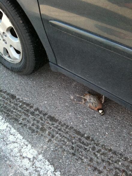 OK CSI. I didn’t run over the bird – look at the tire track coming in. I just parked on top of his grave, which might actually be worse luck that killing him.
