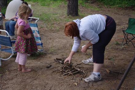 After setting up the camper, Uncle Kenny suggested that we build a fire later that night. Susan and Morgan walked around the area, collecting little sticks for the fire.