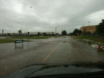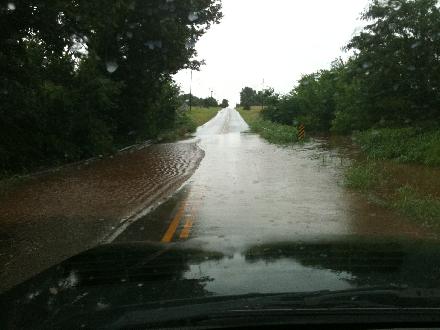 When I left for work Monday morning, it wasn’t even raining in Yukon. By the time the kids and I got to work, it was pouring down. By the time I went to lunch, the roads leading out of work looked like this: