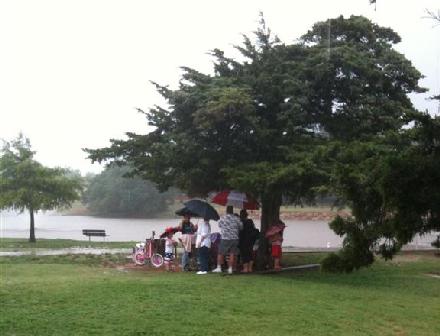 But the rain did not let up. Instead it rained harder, and harder. It rained so hard that the pavilion completely filled up. Some groups and their floats got stuck in the rain. And soon, they ended up going back home. The tissue paper float we saw was completely soaked and ruined. Some of the floats were covered in trash bags in an attempt to keep them dry.