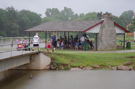 The one advantage we had to everyone else was that, due to our surfing theme, both of my kids and their cousin were all wearing swimming suits. It was at that point that I made a judgement call. We could either leave, or we could walk the parade route with our float and our kids in swimming suits, and then leave. We decided on the latter and was just about ready to do it when an announcement was made at the pavilion. All floats under the pavilion would be judged there, and there would be no parade. Aw.