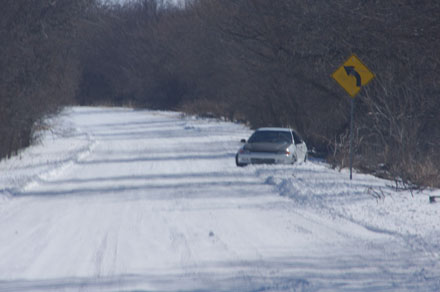 A low-riding Honda with big wheels, a loud muffler, and two dudes in it, about two feet away from going over the edge into the ditch. We pulled up next to them and asked if someone was coming for them. Nope. Knowing that 20 years ago it could have been me in that car, Susan and I hopped out and dug them out with our shovels. After a bit of pushing, rocking and shoving, the Honda made it back on the road, and we went on our way, patting ourselves on the back the entire time.