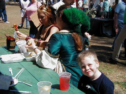 You see stuff like this on television all the time, but it’s not until you’re standing ten feet from a guy that you can really appreciate how difficult some of these tricks are. At one point the guy was balancing on top of a ten-foot ladder, spinning a plate on his face and swinging rings with his arms. Somewhere, mama’s proud. After watching the act for a while Mason got thirsty so we paid $5 for two small drinks and headed over to a picnic table to hang out with some hot medieval wenches.