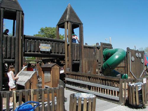 Mason spent another half an hour running, climbing, and swinging on this huge fort-like playground. When he was done, he was really done. We both began whining about how hot it was and how much our feet hurt. After making one last trip around the grounds we heading back to the truck. From there it was time for lunch at Goldies, and then home for a well deserved nap.