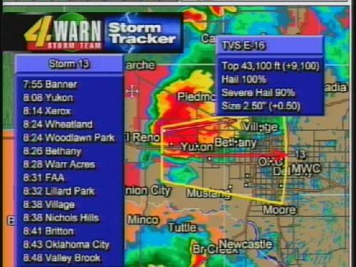 When the projected path of a tornado (seen above with the red line) is drawn through your neighborhood, it’s time to get out of the way. My house is basically where the white dot just below the “nâ€? in Yukon is. From my upstairs window I can plainly see the Xerox plant listed as the 8:14pm arrival point. If it were just me I’d probably take my chances, but with two little ones we decided below ground shelter was the best course of action.
