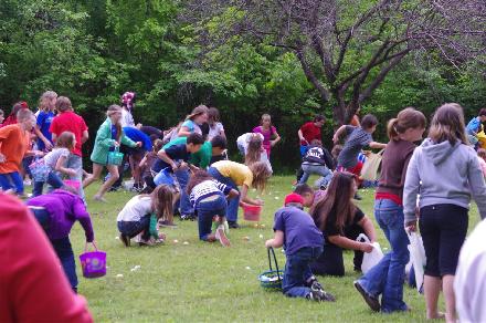 They don’t really hide the eggs, as you can see in this next picture — they just kind of throw them out in the field and, when the siren goes off, the kids make a mad dash and collect all the eggs they can.