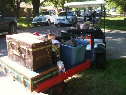 As has been the tradition, the Friday night before Garage Sale Day, I hauled my golf cart over to Dad’s house and had it ready to go. I also took with me my small red trailer that I got last year at last year’s garage sale day, and a cooler full of ice and bottled water.